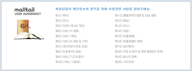 이 약관은 Malltail Inc.(이하 “회사”라 함)가 운영하는 인터넷사이트(www.taillist.com)(이하 “TailList”이라 함)을 통해서 제공되는 전자상거래 관련 서비스 및 기타 서비스(이하 “서비스”라 함)를 이용함에 있어 회사와 이용자의 권리와 의무를 확정하고 이를 이행함으로써 상호 발전을 도모하는 것을 그 목적으로 합니다.