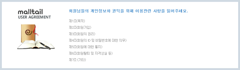 - 1. 이용자는 Malltail이 정한 가입양식에 따라 회원정보를 기입한 후 이 약관에 동의한다는 의사표시를 함으로서 회원가입을 신청합니다.